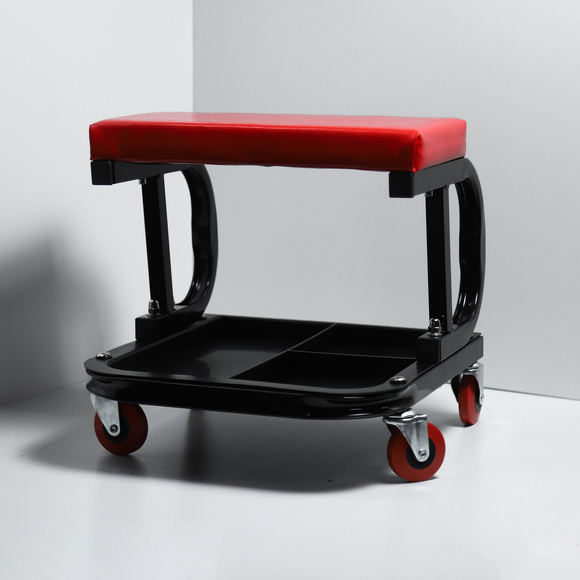 Преміальний матеріал / ергономічний дизайн: Залізний матеріал, міцний і функціональний дизайн, який прослужить довго. Ефективний: Зручне, ергономічне вигнуте сидіння для завдань низького рівня Зберігання: Оснащене лотками для зберігання автохімії, інструментів та аксесуарів. Зручно зберігайте необхідні інструменти під сидінням, щоб заощадити час. Табурет з поліуретану: Губчаста табуретка з поліуретанового матеріалу зручніша для сидіння. Дозволяє сидіти і працювати протягом тривалого періоду часу без дискомфорту. Плавне кочення / поворотні ролики: Зчеплення і гнучкий гумовий протектор на роликах ставить вас в положення, яке полегшує роботу. Характеристики: Розмір: 36,4×36,5×36,5 см Матеріал: Сталь + поліуретан + губка Основний колір: чорний