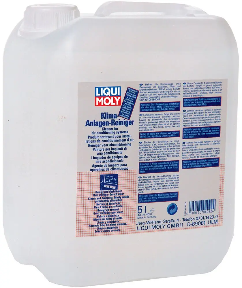 Рідина для професійного очищення кондиціонера - Liqui Moly Klima-Anlagen-Reiniger Liqui Moly Klima-Anlagen-Reiniger спеціально розроблена рідина для професійного очищення кондиціонерів від грибків та бактерій. Крім очищення Klimaanlagen-Reiniger має відмінні властивості освіжувача повітря, залишає після очищення свіжий приємний запах. Очищувач кондиціонерів Liqui Moly Klima-Anlagen-Reiniger – це спеціальна рідина для оптимального та ефективного очищення кондиціонера без демонтажу. Видаляє грибки та бактерії. При використанні засобу нейтралізується неприємний запах, що виникає під час роботи кондиціонера через розмноження грибків і бактерій на випарнику кондиціонера. Усуває бактерії та грибки в системі автомобільних та побутових кондиціонерів. Усуває неприємні та гнильні запахи, що виникають при включенні кондиціонера. Видаляє пил та розчинні забруднення з випарника та повітроводів кондиціонерів. Покращує мікроклімат у салоні автомобіля або у приміщенні. Знижує ризик застудних та легеневих захворювань, робить поїздку комфортнішою. Гіпоалергенний склад з лимонною ароматом. Більшість виробників, наприклад Mercedes Benz, BMW, Ford, Opel, VW, рекомендує проводити періодичне сервісне обслуговування кондиціонерів - їх очищення. Схвалено VW. Властивості Klima-Anlagen-Reiniger містить водний розчин бронополу, що знищує всі відомі грибки та бактерії, у тому числі легіонел. Створює захисний антибактеріальний прошарок тривалої дії. При дії препарату, пил та залишки бактерій зливаються в дренаж кондиціонера, усувається характерний затхлий запах. Повітря, що приходить з салон, набуває ненав'язливого лимонного аромату. Зберігає дію до півроку. Видаляє неприємний запах Знищує грибки та бактерії Утворює на випарнику захисну плівку Очищує повітряні канали Працює як освіжаючий засіб Підвищує комфортність їзди Протестовано на мікробіологічну безпеку для людини Забезпечує безпечний та комфортний мікроклімат у салоні, захищає від простудних та легеневих захворювань. Сфера використання Klimaanlagen-Reiniger спеціально призначений для очищення та дезінфекції кондиціонерів легкових автомобілів, автобусів, вантажівок та побутових кондиціонерів. З обережністю використовуйте біоцидні продукти. Перед використанням обов'язково прочитайте етикетку та інформацію про продукт. У разі кондиціонерів у вантажних автомобілях, автобусах та домашніх кондиціонерів розпорошувати рідину, що чистить, по можливості безпосередньо на поверхню випарника. Застосування 1 л достатньо для обробки одного автомобіля чи одного кондиціонера. Якщо є сервісні рекомендації виробника з очищення кондиціонера, їх необхідно дотримуватися. Klimaanlagen-Reiniger представляє готову до використання рідину та використовується без розведення. Для ефективного використання рекомендується застосовувати спеціальний пістолет для очищення Klimaanlagen-Reinigungspistole артикул 4090. На час очищення відкрити вікна. Під час очищення уникати вдихання пари. Переконатись у тому, що отвори для зливу конденсату є вільними. Протягом 10 хв. висушити поверхню випарника при працюючому двигуні, встановивши для цього обігрівач салону та регулятор потужності обдування в наступне положення: Вимкнути кондиціонер та перевести в режим рециркуляції Перемикач повітророзподільника перевести в положення обдування ніг Регулятор температури та перемикач потужності обдування встановити в 