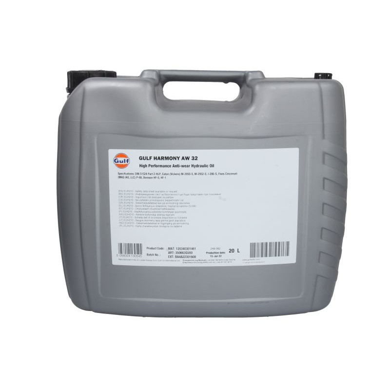 Олива Gulf Harmony AW 32. Високоефективна протизносна гідравлічна олива, призначена для використання в гідравлічних системах високого тиску, що працюють у помірних і важких умовах мобільного та промислового застосування. Ця олива, створена на основі високоякісних базових олив, містить ретельно відібрані присадки для забезпечення оптимального захисту від іржі, корозії, зношування та окислення. Рекомендується для гідравлічних систем, що працюють в помірних і важких умовах мобільного та промислового застосування. Також підходить для старих гідравлічних систем, де виникають проблеми з витоками, мобільних гідравлічних систем передачі енергії та загального змащування машин.