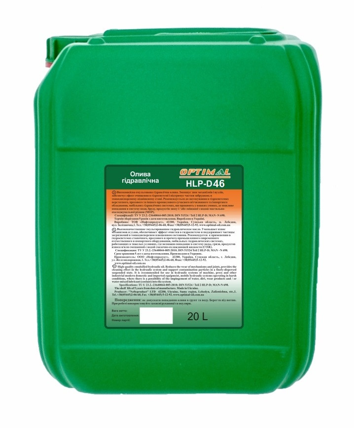 Олива HLP-D 46 - високоякісна, емульгована, гідравлічна олива, яка зменшує зношення механізмів і вузлів, забезпечує ефект очищення в гідросистемі і підтримують частки забруднень в тонкодисперсном підвішеному стані. Олива надає комбінуючі детергируючі, змочуючі та диспергируючі властивості.