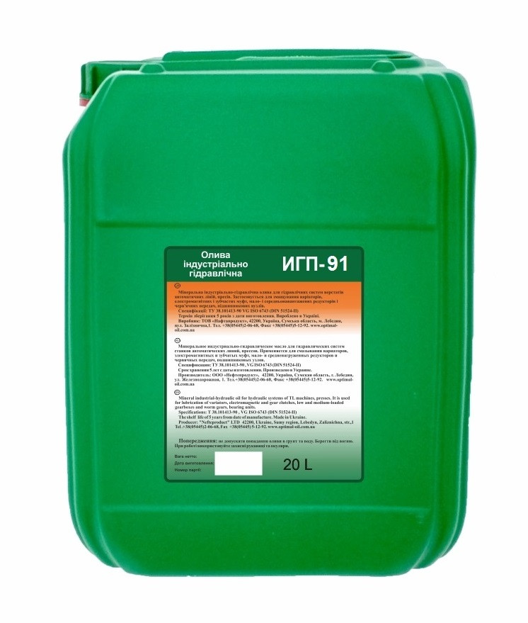 Олива гідравлічна індустріальна ИГП-91 використовується в гідравлічних системах важкого пресового обладнання і для змащування шестеринчастих передач, середньонавантажених зубчастих і черв'ячних редукторів, у циркуляційних системах мастила різного обладнання.