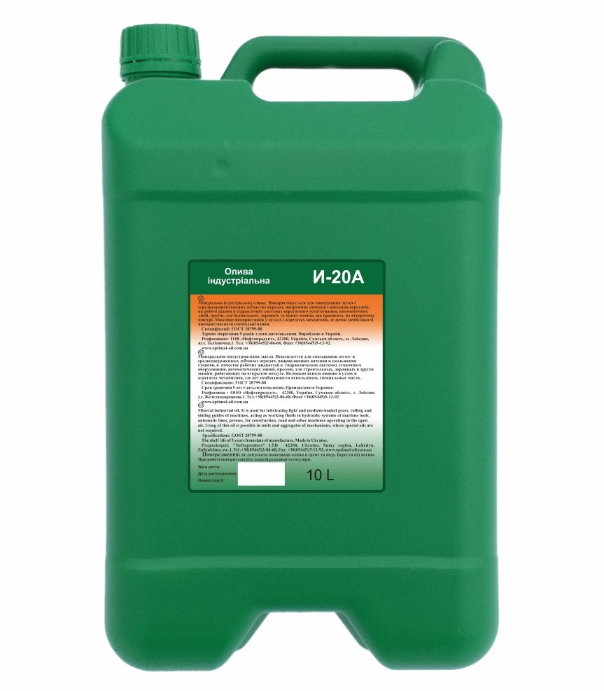 Індустріальна олива І-20А - дистилятна олива або суміш залишкової та дистилятної нафтових олив, отриманих із сірчистих та малосірчистих нафт селективного очищення.