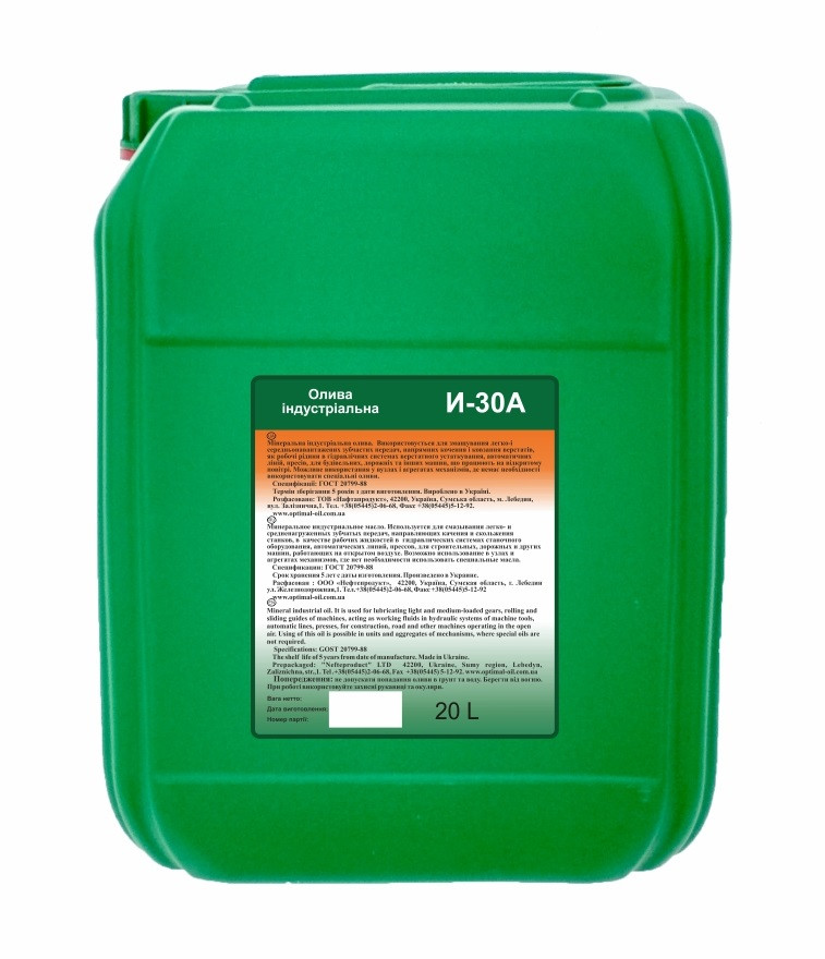 Індустріальна олива І-30А - дистилятна олива або суміш залишкової та дистилятної нафтових олив, отриманих із сірчистих та малосірчистих нафт селективного очищення.