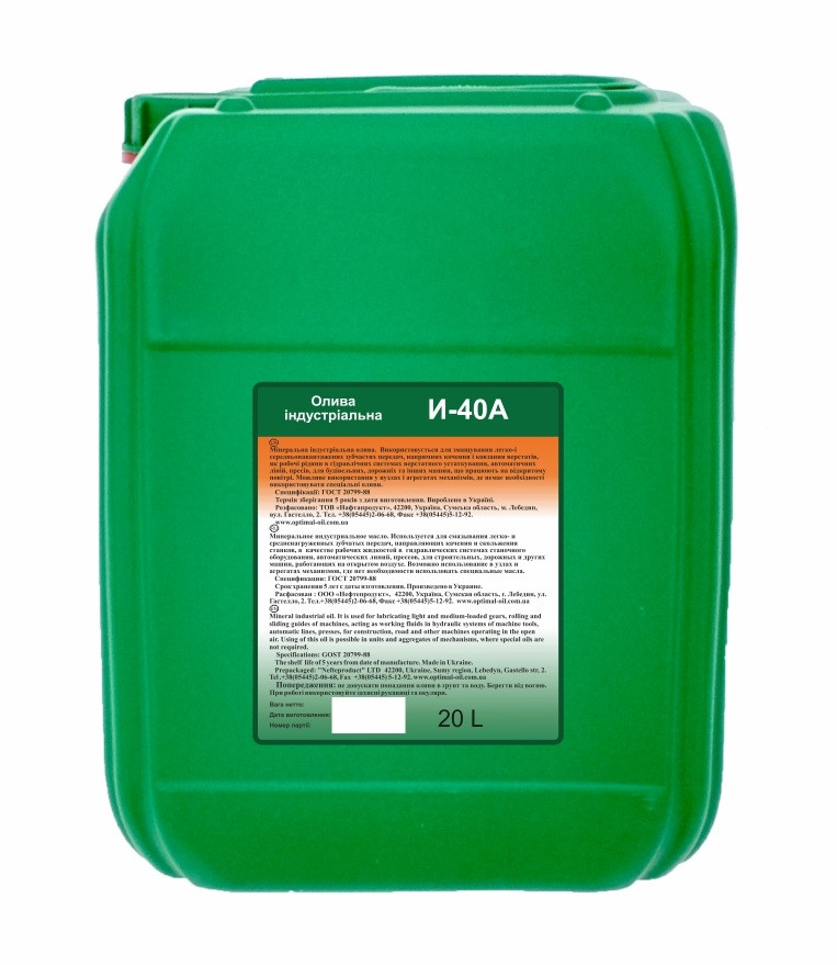 Індустріальна олива І-40А - дистилятна олива або суміш залишкової та дистилятної нафтових олив, отриманих із сірчистих та малосірчистих нафт селективного очищення.