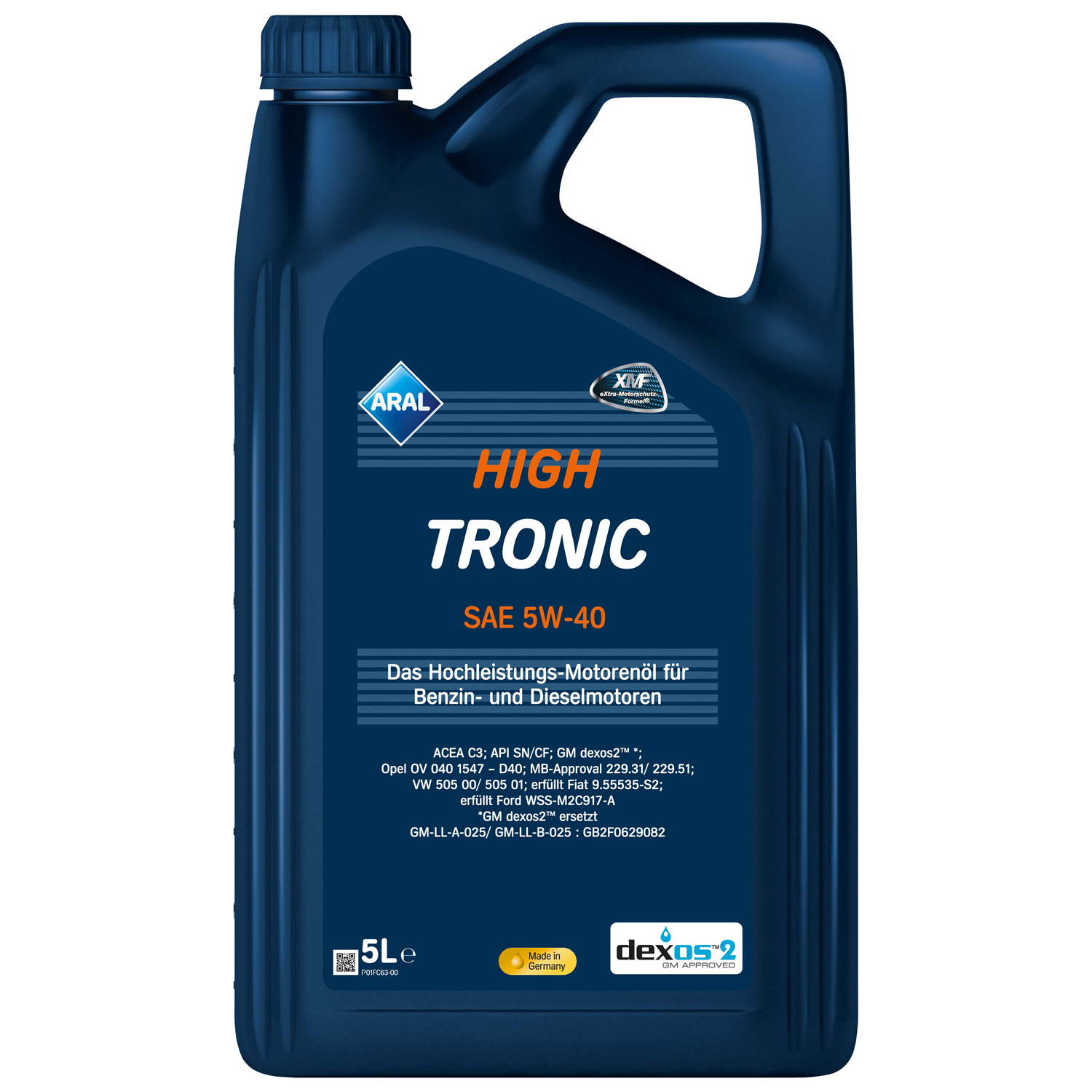 Aral HighTronic 5W-40 - високоякісна моторна олива для сучасних бензинових і дизельних легкових автомобілів, створена із застосуванням технології AralXMF. Експлуатаційні і технічні характеристики близькі до повністю синтетичних олив Aral - зверніть увагу на допуски Mercedes-Benz, BMW, Porsche і GM, але пропонує перевагу в ціні. Його формула дозволяє реалізувати подовжені (відповідно до рекомендацій виробника автомобіля) інтервали заміни. Aral HighTronic 5W-40 - низькозольна олива. У складі вміст сульфатної золи, фосфору і сірки знаходиться в рамках лімітів, встановлених для безпроблемної взаємодії з сучасними системами очищення вихлопних газів, зокрема з фільтрами саж DPF. Такі фільтри очищають відпрацьовані гази дизельних двигунів шляхом збору і автоматичного дожига сажі, що дозволяє виконати суворі вимоги норм Euro V і Euro VI. Фільтри DPF в силу своєї конструкції дуже вимогливі до якості використовуваних пального і олив. Моторні оливи повинні проводитися по низькозольний технології (Low-SAPS). У таких оливах застосовується нове покоління присадок, які виконують колишні завдання, але мають новий склад. Як і всі синтетичні оливи Aral, HighTronic 5W-40 забезпечує легкий зимовий пуск, чистоту двигуна і надійний захист від зносу.