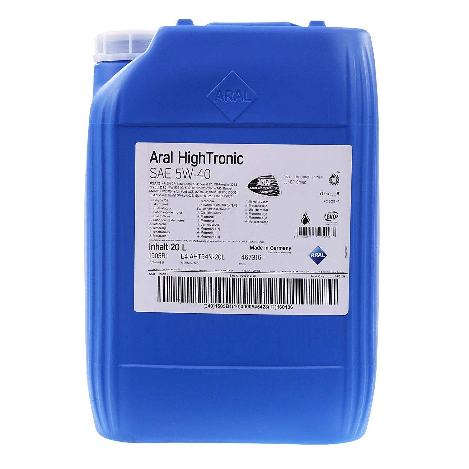 Низькозольна моторна олива Aral Hightronic 5w-40 синтетична, у виробництві якої застосовують метод Aral XMF. Надійно захищає двигун від зношення в несприятливих умовах експлуатації. Гарантія плавного старту і безперервної роботи в холодну пору року. Особливості: для сучасних бензинових двигунів, починаючи з 2010 року випуску; для дизельних двигунів із наявністю непрямого упорскування, із насос-форсунками; для оснащених системою очищення викидних газів, із наявністю сажового фільтра.