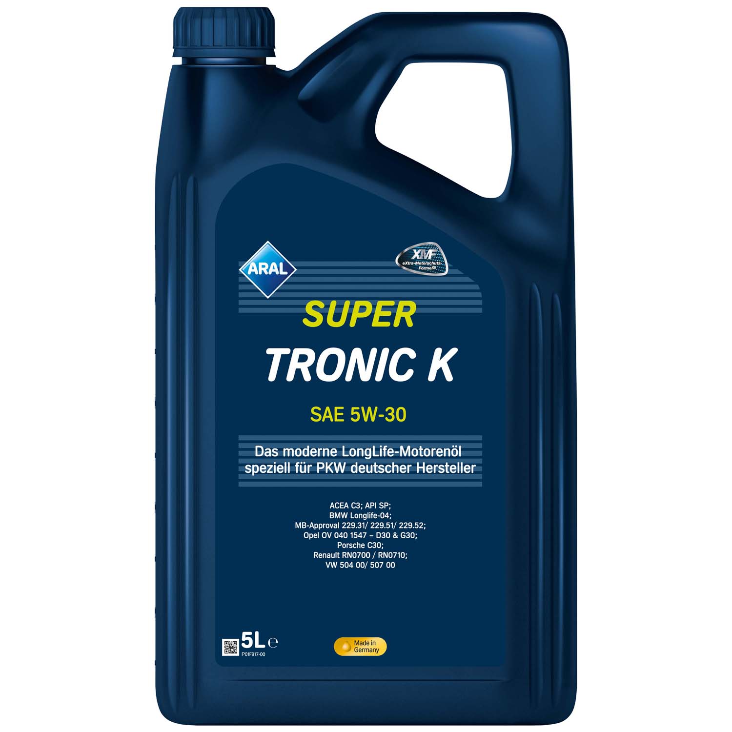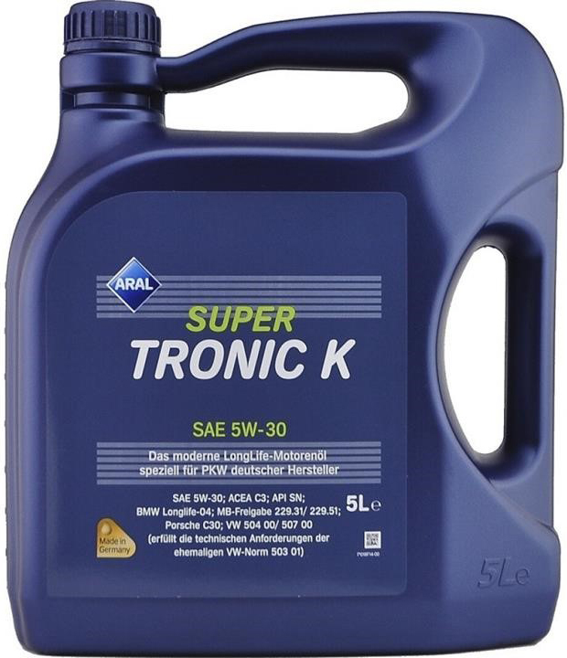 Aral SuperTronic K 5W-30 Низькозольна моторна олива, розроблена, в першу чергу, для найсучасніших бензинових та дизельних двигунів BMW. Також має офіційні схвалення VW 504.00/507.00, Mercedes-Benz 229.51, Porsche C30. В оновленій рецептурі BMW LL-04 змінено вимоги до властивостей масла з захисту двигуна від зносу, утворення та накопичення відкладень, коксування турбонагнітачів. Особливо актуальні зміни стали для найсучасніших бензинових термонавантажених двигунів та моторів, що працюють у важких умовах. Оновлений допуск BMW LL-04 за своїми властивостями та характеристиками повністю перекриває та замінює попередню редакцію цієї специфікації. Дана олива застосовується як у дизельних, так і бензинових двигунах, в тому числі оснащених сажовими фільтрами DPF.