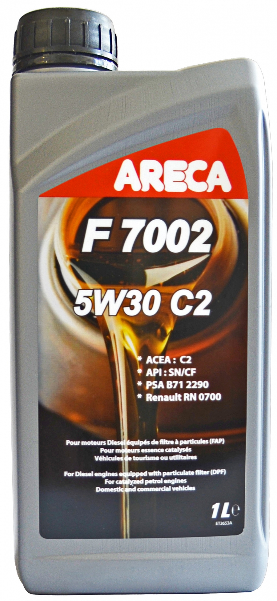 ARECA F7002 5W-30 це малов'язке синтетичне моторне масло, розроблене для сучасних французьких бензинових та дизельних двигунів із застосуванням технології Low SAPS (низький вміст сірки та фосфору). ARECA F7002 5W-30 не порушує роботу систем очищення відпрацьованих газів, у тому числі сажевого фільтра (DPF), має чудові протизносні та енергозберігаючі властивості. ARECA F7002 5W-30 також підходить для низки моделей Fiat, Lancia та нових двигунів Honda, Toyota, Mazda.