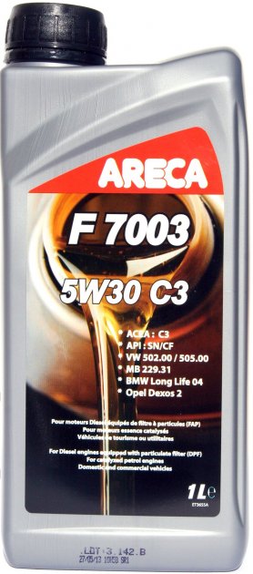 ARECA F7003 5W-30 це синтетична моторна олія останнього покоління, виготовлена ??з використанням технології Low SAPS. ARECA F7003 5W-30 відповідає строгим вимогам, що пред'являються до мастил для сучасних дизельних та бензинових двигунів Opel –dexos2, забезпечує максимальний термін служби фільтра сажі (DPF), низький знос, хорошу чистоту двигуна, а також дозволяє реалізовувати збільшені інтервали заміни масла. ARECA F7003 5W-30 рекомендовано для бензинових та особливо дизельних двигунів Opel (починаючи з 2000 року) та BMW (починаючи з 1998 року). Також підходить для Mercedes-Benz, VW та більшості автомобілів корейського та японського виробництва.