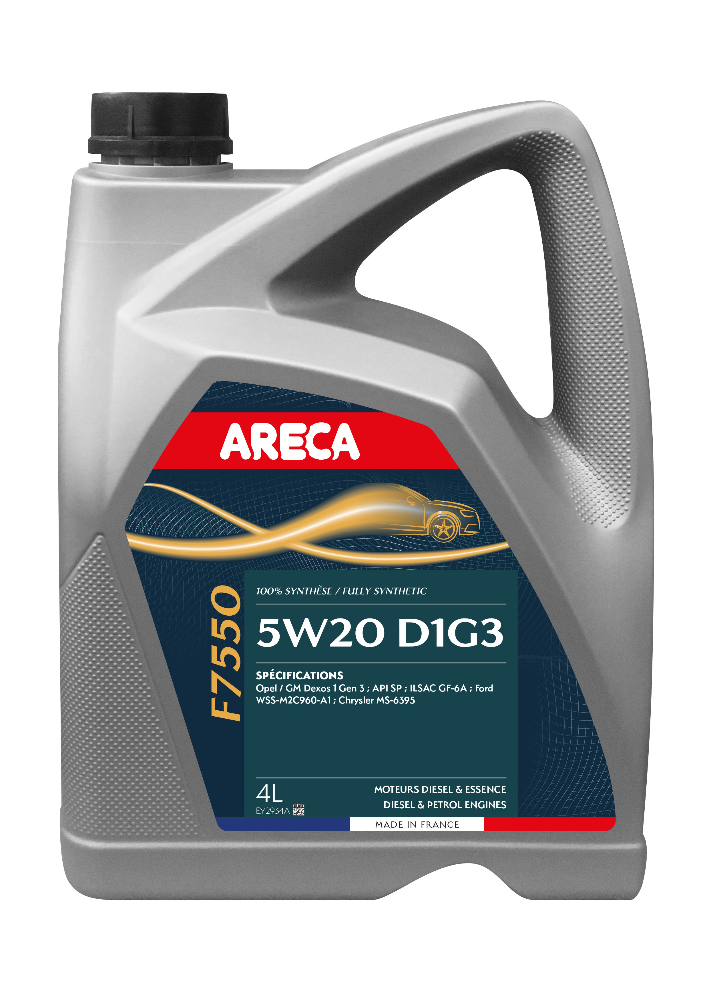 Високоякісна синтетична моторна олива, що забезпечує: Захист від зносу; Тривалу ефективність систем доочищення вихлопних газів (технологія 'Low-SAPS'); Економію пального; Високий рівень захисту від LSPI (передчасне запалювання на низьких обертах) у двигунах з безпосереднім впорскуванням. ARECA F7550 спеціально розроблена для двигунів General Motors та Opel, де рекомендована специфікація Dexos 1 Gen 3. Також ідеально підходить у випадках, коли потрібен рівень API SP та/або ILSAC GF-6A. Специфікації та допуски: Opel / GM Dexos 1 Gen 3; API SP; ILSAC GF-6A; Ford WSS-M2C960-A1; Chrysler MS-6395.