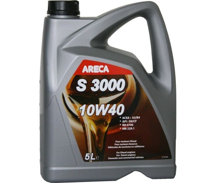 Напівсинтетична моторна олія 10W40 Areca S3000 - це моторна олія створена за абсолютно новою, передовою рецептурою. Містить високоякісні синтетичні масла, і пакет присадок для важких умов експлуатації (посилені протизносні характеристики, високостабільний модифікатор в'язкості та мийно-диспергуючий комплекс). Напівсинтетична моторна олія 10W40 Areca S3000 адаптована для всіх сучасних двигунів – бензинових або дизельних (включаючи обладнані турбонаддувом), легкових та малотоннажних автомобілів. Напівсинтетична моторна олія 10W40 Areca S3000 має допуск максимальної якості по API – SN, що дозволяє його використовувати у всіх корейських, японських та американських автомобілях, за винятком спецдопуску. Моторна олія 10W40 Areca S3000 ідеально підходить для використання у мікроавтобусах та легкових автомобілях з пробігом, особливо французького виробництва. Переваги: В'язкі властивості, що забезпечують чудову плинність масла при низьких температурах, гарантують легкий запуск двигуна і негайну подачу масла до всіх деталей. Чудова в'язкість за високих температур гарантує стабільність масляної плівки. Термічна стабільність дозволяє використовувати олію цілий рік. Використання синтетичних базових масел, що дає слабку леткість олії. Вміст хлору нижче 50 ppm