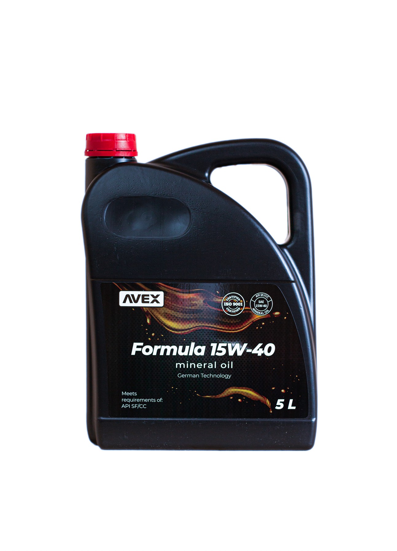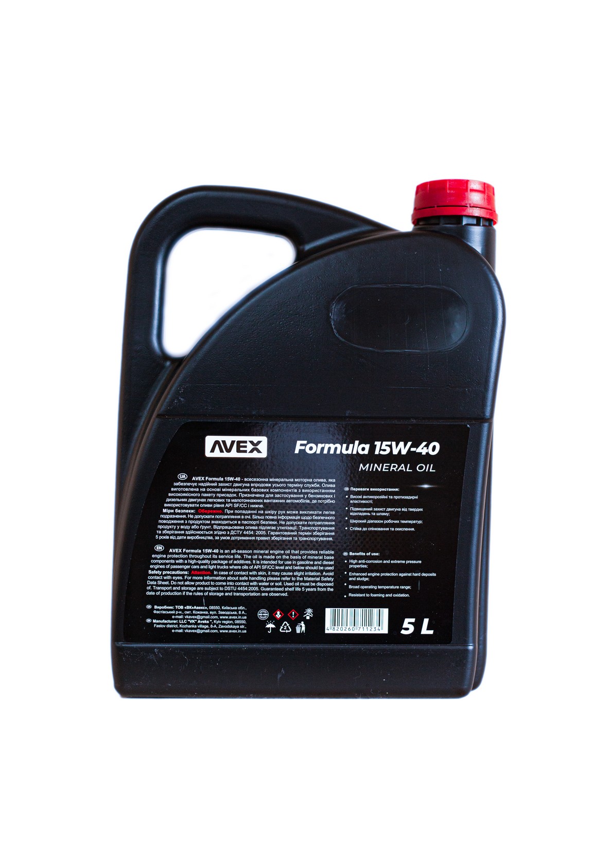 Моторна олива AVEX Formula 15W-40 - всесезонна мінеральна моторна олива, яка забезпечує надійний захист двигуна впродовж усього терміну служби. Олива виготовлена на основі мінеральних базових компонентів з використанням високоякісного пакету присадок. Призначена для застосування у бензинових і дизельних двигунах легкових та малотоннажних вантажних автомобілів, де потрібно використовувати оливи рівня API SF/CC і нижче. • Високі антикорозійні та протизадирні властивості • Підвищений захист двигуна від твердих відкладень та шламу • Широкий діапазон робочих температур • Стійка до спінювання та окислення