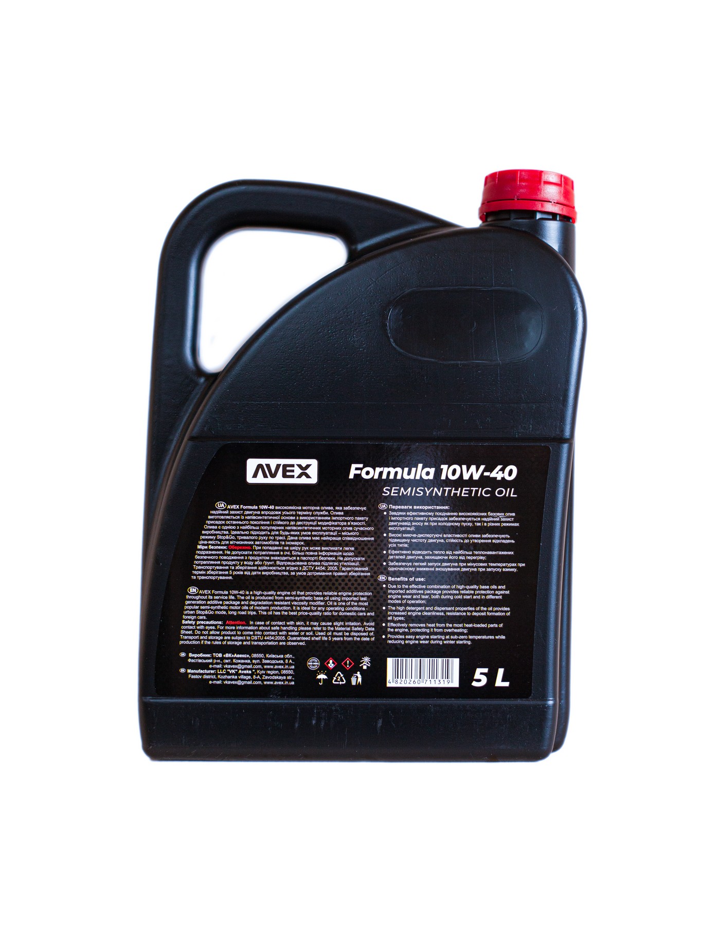 Моторна олива AVEX Formula 10W-40 високоякісна моторна олива, яка забезпечує надійний захист двигуна впродовж усього терміну служби. Олива виготовляється із напівсинтетичної основи з використанням імпортного пакету присадок останнього покоління і стійкого до деструкції модифікатора в’язкості. Олива є однією з найбільш популярних напівсинтетичних моторних олив сучасного виробництва. Ідеально підходить для будь-яких умов експлуатації – міського режиму Stop&Go, тривалого руху по трасі. Дана олива має найкраще співвідношення ціна-якість для вітчизняних автомобілів та іномарок. • Завдяки ефективному поєднанню високоякісних базових олив і імпортного пакету присадок забезпечується надійний захист двигуна від зносу як при холодному пуску, так і в різних режимах експлуатації • Високі миюче-диспергуючі властивості оливи забезпечують підвищену чистоту двигуна, стійкість до утворення відкладень усіх типів • Ефективно відводить тепло від найбільш теплонавантажених деталей двигуна, захищаючи його від перегріву • Забезпечує легкий запуск двигуна при мінусових температурах при одночасному зниженні зношування двигуна при запуску взимку
