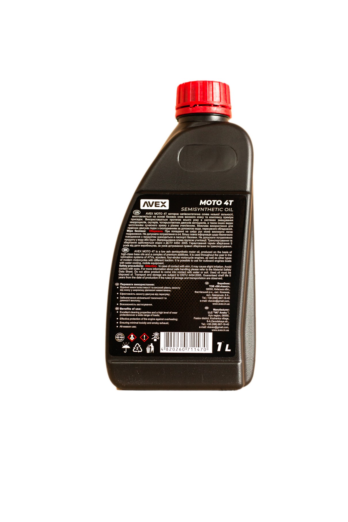 Моторна олива AVEX MOTO 4T моторна напівсинтетична олива низької зольності, виготовляється на основі базових олив високого класу та комплексу преміум присадок. Використовується протягом всього року в системах змащування квадроциклів, скутерів, чотирьохтактних двигунів мотоциклів, а також інших видах мототехніки сучасного зразку з різним зчепленням. Можливе використання для підвісних двигунів лодок з охолодженням за допомогою води, пересувного обладнання.