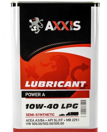 10W-40 LPG AXXIS Power A - універсальна високотехнологічна напівсинтетична моторна олія, LPG - рекомендована для двигунів з ГБО, що працюють на газу. Призначене для використання в бензинових та дизельних двигунах легкових автомобілів та мікроавтобусів. Підходить для двигунів, оснащених турбокомпресором і без нього. Перевищує допуски: ACEA A3/B4, SL/CF API, MB 229.1, VW 500.00/502.00/505.00 Вироблено під контролем D.B. DEVELOPMENT SERVICES LIMITED, UK.