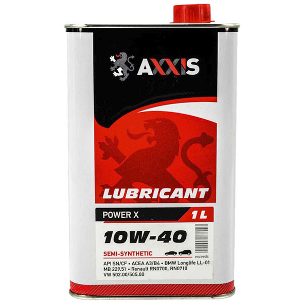 10W-40 AXXIS Power X SEMI-SINTHETIC - Напівсинтетична моторна олія з низьким коефіцієнтом тертя, призначена для використання у високопродуктивних бензинових та дизельних двигунах з прямим упорскуванням легкових автомобілів та легких вантажівок, у тому числі з турбонаддувом. Перевищує допуски: API SN/CF ACEA A3/B4 MB 229.51; BMW Longlife LL-01; Renault RN0700, RN0710; VW 502.00/505.00 Проведено під контролем D.B. DEVELOPMENT SERVICES LIMITED, UK.