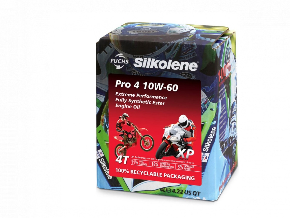 Мотопродукція Silkolene є одним з передових напрямів діяльності концерну Fuchs. Вся продукція Silkolene поставляється англійською заводом Fuchs Lubritec, також випускає мастильні матеріали для авіа та космічної промисловості, що саме по собі говорить про високу якість даної продукції. Впровадження передової технології XP (Extra Perfomance - поліпшені експлуатаційні характеристики) при виробництві моторних олив для мотоциклів забезпечує економію палива, більш низьку витрату оливи, відповідність вищим специфікаціям по API і поліпшення ефективної потужності двигуна. Моторні оливи даного бренду діляться на три типи - синтетичні виготовлені на основі подвійних ефірів (серія олив з червоною етикеткою, в основному серія PRO), синтетичні ефірні оливи (жовта етикетка, серія COMP) і напівсинтетичні (сіра етикетка, серія Super). Також дані продукти поставляються в різних класах в'язкості по SAE щоб максимально задовольнити вимоги різних видів мототехніки. Оливи серії PRO 4 XP ідеально підходять для всіх чотирьохтактних двигунів мотоциклів високої потужності, в тому числі з істотно збільшеною потужністю в слідстві тюнінгу. Регулярне використання оливи Silkolene в гонках підтвердило його вийняткові протизносні і мастильні характеристики навіть при екстремальних температурах і навантаженнях. Застосування: Оливи серії PRO 4 XP випускаються в трьох класах в'язкості 10W-40, 15W-50 і 10W-60 PRO 4 10W-40 XP відповідає вимогам, викладеним в інструкціях по експлуатації мотоциклів більшості відомих виробників. PRO 4 15W-50 XP найкраще підходить для моторів мотоциклів об'ємом понад 750 см? в жарких кліматичних умовах. PRO 4 10W-60 XP рекомендується для двигунів з великим робочим об'ємом при високих навантаженнях і температурах, а також для двигунів в яких трапляється розрідження оливи паливом. Перед вибором моторного оливи рекомендується ознайомитися з вимогами виробника в сервісній книжці мотоцикла. Властивості: • Використовує подвійні синтетичні ефіри, запозичені з авіаційних мастильних матеріалів, що забезпечує відмінні протизносні властивості в широкому температурному діапазоні; • Ефективні присадки розроблені спеціально для мотоспорту власною лабораторією концерну, модифікують поверхню, захищають поршні, канали, кулачки і підшипники з моменту запуску двигуна; • Висока термічна стійкість і стабільність до зрушення дозволяють оливі зберігати клас в'язкості протягом всього терміну служби, в той час як висока міцність змащувалбної плівки знижує тертя і знос, забезпечуючи надійну роботу двигуна і коробки передач і довгий термін служби їх складових; • Прекрасні миючі властивості дозволяють досягти високу чистоту внутрішніх елементів двигуна і підтримувати його потужність і надійність на стабільно високому рівні; • Швидке відділення повітря зводить до мінімуму ризик масляного голодування; • Лабораторні випробування та застосування оливи в гонках підтвердили помітне зростання потужності.