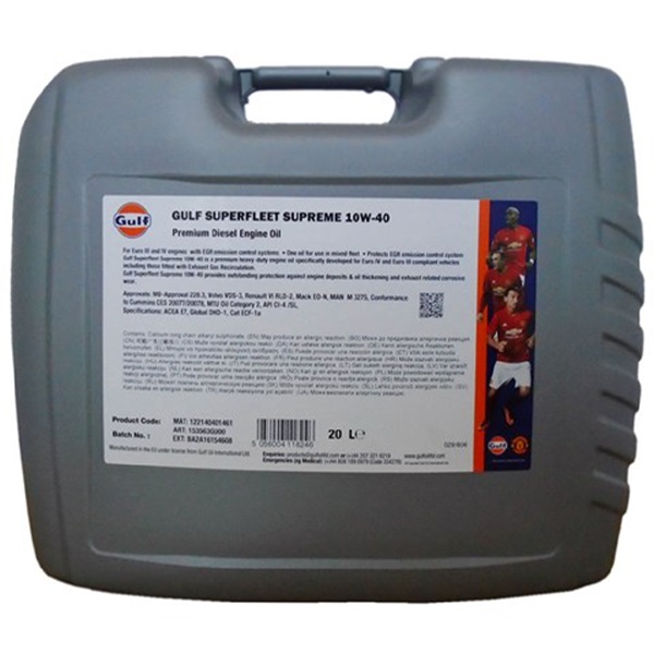 Олива Gulf Superfleet Supreme 10W-40. Gulf Superfleet Supreme з технологією Clean-Flow зменшує загустіння оливи, підтримує двигуни чистими та продовжує термін служби двигуна. Ця вдосконалена олива для дизельних двигунів мінімізує час простою та витрати на технічне обслуговування. Рекомендується для дизельних двигунів з наддувом і без наддуву, що використовуються в дорожніх застосуваннях, включаючи ті, що оснащені системами рециркуляції відпрацьованих газів і відповідають стандартам викидів США 2004, запровадженим у 2002 році. Також підходить для автомобілів Euro 4, які не потребують олив з низьким вмістом SAPS (не обладнаних DPF), автомобілів Euro 3 і більш ранніх версій, а також для важких дизельних двигунів, що використовуються в гірничодобувній промисловості, будівництві, сільському господарстві та інших позашляхових застосуваннях.