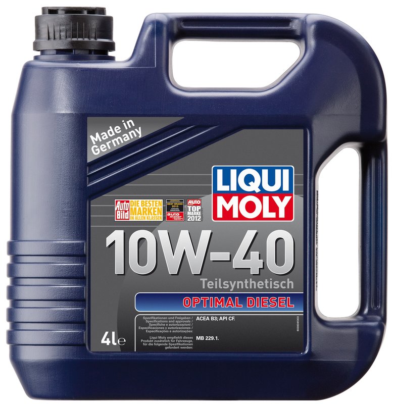 Optimal Diesel 10W-40 напівсинтетична моторна олива спеціально для дизельних двигунів з адаптованим для українських умов пакетом присадок. Задовольняє сучасні міжнародні стандарти API/ACEA. Підходить для кола дизельних іномарок попередніх поколінь. У моторному маслі використовуються синтетичні та мінеральні базові компоненти, що відрізняються високими захисними властивостями. Масло містить спеціальний пакет присадок, розроблений для дизельних двигунів, який забезпечує високий рівень захисту від зношування та гарантує стабільне надходження масла до всіх деталей двигуна. - спеціальна формула для дизельних двигунів без фільтру сажі - надійний захист від зносу - низька витрата масла - оптимальна чистота двигуна Завдяки доступній ціні, масло Optimal є оптимальним співвідношенням ціни і справжньої німецької якості. Допуски та специфікації: API CF; ACEA B3/B4 LIQUI MOLY рекомендує цей продукт додатково для транспортних засобів, які потребують наступних специфікацій: VW 502 00 / 505 00; MB 229.1