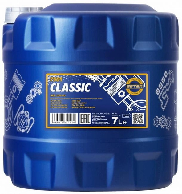 CLASSIC 7л HC Synthese engine oil; SAE 10W-40; API SN/CH-4; ACEA A3/B4; MB 229.3; VW-Norm 501 01/505 00; RENAULT RN 0700 / RN 0700