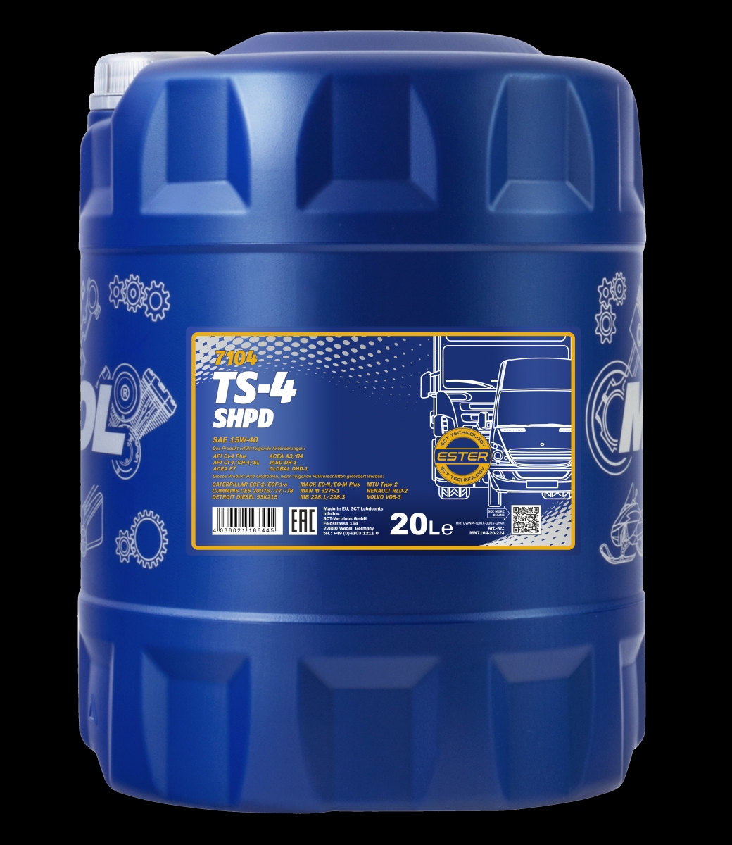 TS-4 EXTRA SHPD 20л SAE 15W-40; API CI-4/SL; ACEA E7, A3/B4; JASO DH-1; GLOBAL DHD-1; MAN M 3275-1; DEUTZ DQC III-05; VOLVO VDS-3; MB 228.3 (Approval 2019-12-08 EXPIRED); MB 229.1; MACK EO-N / EO-M Plus; DETROIT DIESEL 93K215; CAT ECF-2 / ECF-1-a; MTU DDC Type 2; RENAULT VI RLD-2; CUMMINS CES 20078