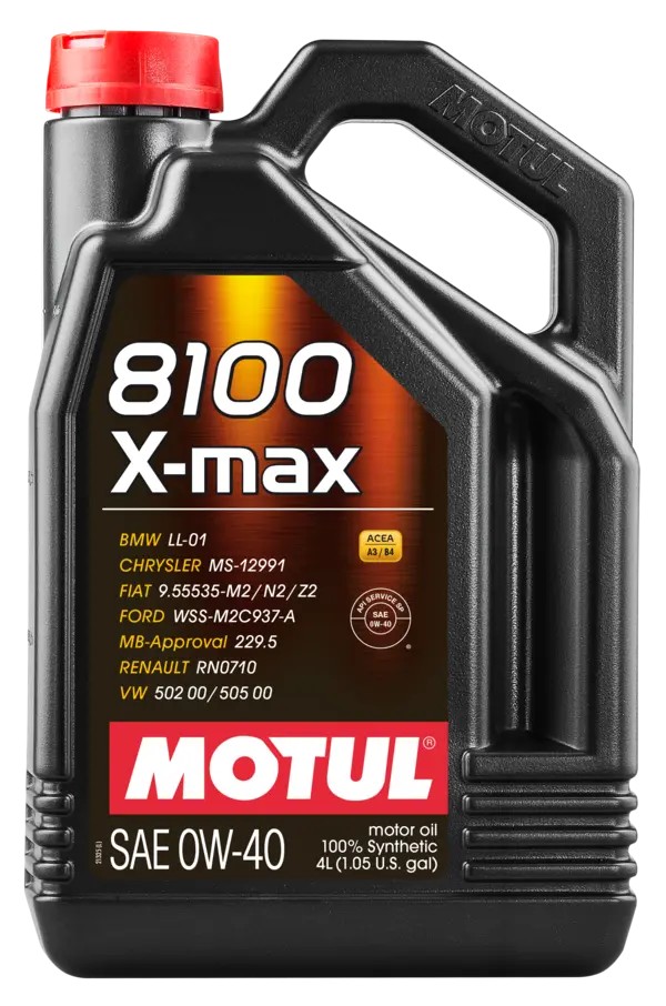 8100 X-MAX 0W-40 МОТОРНЕ олива для бензинових і дизельних двигунів 100% синтетична. Високотехнологічне 100% Синтетична моторна олива. Виготовлено за технологією класичного вмісту сульфатної золи, фосфору та сірки (Full SAPS). Спеціально розроблено для останнього покоління потужних бензинових та дизельних двигунів у т.ч. з безпосереднім упорскуванням та турбонаддувом. Має схвалення автовиробників, що дозволяє використовувати його у гарантійних автомобілях. Призначений для двигунів, що працюють на будь-якому типі палива: бензин, дизельне паливо, скраплений нафтовий газ. Сумісно з каталітичними конверторами. При необхідності перед застосуванням слід ознайомитися з інструкцією з експлуатації транспортного засобу. Характеристики Схвалення BMW Long Life-01 накладає серйозні обмеження на мастильні матеріали, пов'язані із системою Valvetronic. Ця вимога всіх двигунів BMW, починаючи з 2001 року, також перекриває вимоги специфікації BMW LL-98. З 2004 року автомобілі BMW вимагають моторних масел з схваленням BMW LL-04, напр: MOTUL 8100 5W-30. Одночасно схвалення BMW LL-01 відповідає вимогам всіх бензинових двигунів BMW, що експлуатуються поза Європейським Союзом, Швейцарією, Норвегією та Ліхтенштейном. Необхідно ознайомитись із рекомендаціями BMW. Стандарт MB 229.5 висуває суворіші вимоги до маслу порівняно з MB 229.3 у частині старіння та стійкості масляної плівки (при збільшених інтервалах заміни масла, що встановлюються бортовою системою діагностики). Підвищена миюча-диспергувальна здатність ACEA B4 та паливна економічність 1,7% порівняно з олива ми класу в'язкості 15W-40. Специфікація MB 229.5 поширюється на всі бензинові двигуни MERCEDES, включаючи AMG (клас в'язкості 5W-40), за винятком SLR, а також дизельні двигуни MERCEDES без DPF фільтрів. Стандарт Porsche A40 вимагає високої стійкості оливи до деструкції. Ця специфікація поширюється на всі двигуни PORSCHE, за винятком Cayenne V6 та дизельних версії (для цих двигунів, використовуються оливи відповідні стандарту Porsche C30, напр: MOTUL 8100 X-clean+ 5W-30). MOTUL 8100 X-max 0W-40 відповідає сучасним вимогам виробників автомобілів щодо ефективності та довговічності, а також останньої вимоги API SN. Стандарт API SN вимагає від мастила найвищих мийно-диспергувальних властивостей, покращеної в'язкісної стабільності в умовах попадання сажі, високих змащувальних та протизносних властивостей, високої термоокислювальної стабільності, зменшеного споживання масла та забезпечення захисту двигуна на всьому міжзмінному інтервалі. Клас в'язкості SAE 0W-40 мінімізує гідродинамічний тертя в маслі, дозволяючи економити паливо в умовах низьких температур. Збільшується швидкість потоку масла при запуску двигуна, швидше створюється робочий тиск масла, швидше відбувається протікання масла масляними каналами, масло швидше прогрівається до робочої температури. Екологічно чисте: цей тип олив дозволяє зменшити споживання палива та таким чином мінімізувати викиди парникового газу (CO2). Багато виробників автомобілів, такі як: NISSAN, JAGUAR, LAND-ROVER… рекомендують використовувати масло з класом в'язкості 0W-40 та рівнем експлуатаційних властивостей не нижче за API SM для більшості своїх спортивних автомобілів, наприклад, таких як NISSAN GT-R, 370Z, 350Z ,… MOTUL 8100 X-max 0W-40 має чудовий баланс між економією палива та ефективним захистом двигуна (в'язкість HTHS вище 3,5 мПа.с). Рекомендації щодо застосування Заміна здійснюється відповідно до рекоменд
