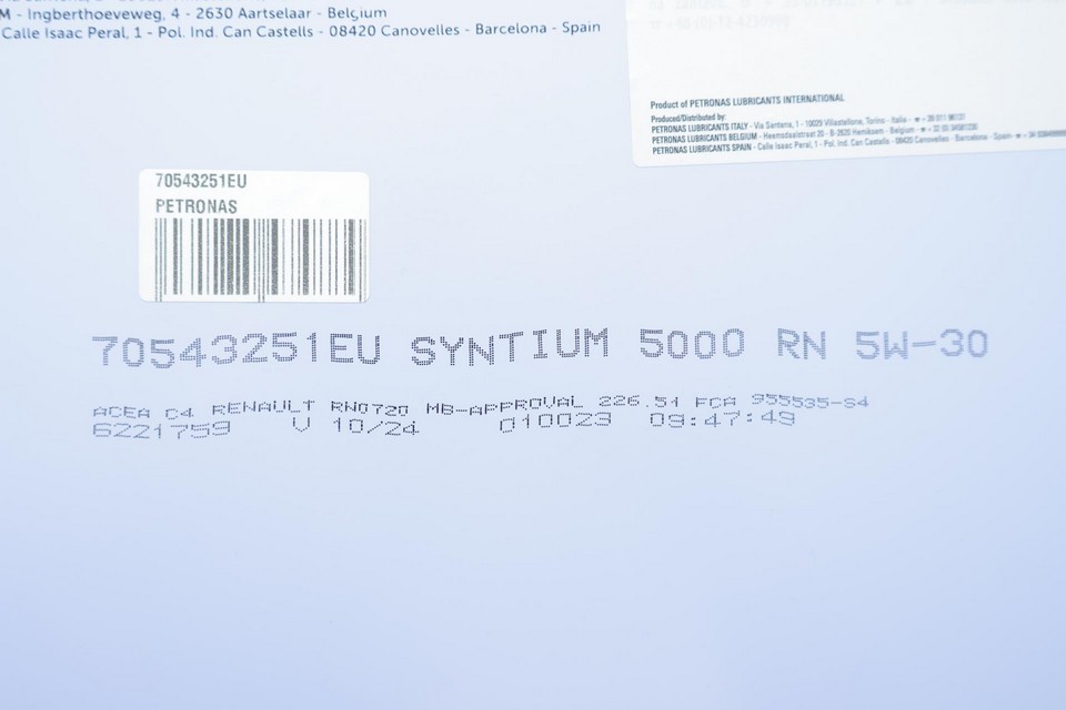 PETRONAS Syntium 5000 RN 5W-30 — це олива з низьким вмістом золи, яка підходить для всіх типів легкових автомобілів, особливо для двигунів групи Renault, де зазначено Renault RN0720 і ACEA C4.