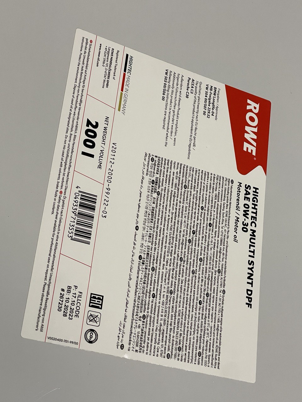 Олива моторна ROWE HIGHTEC MULTI SYNT DPF 0W-30 200л. 20112200099