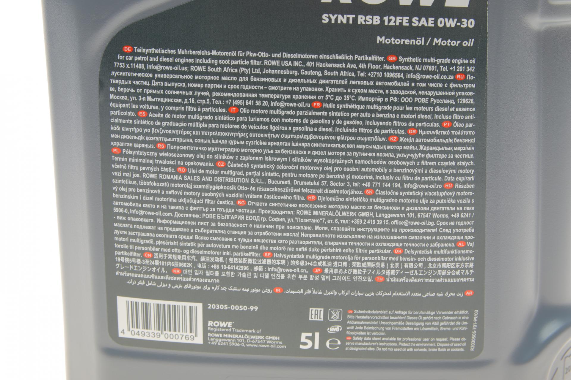 Олива моторна ROWE HIGHTEC SYNT RSB 12FE 0W-30 5л. 20305005099
