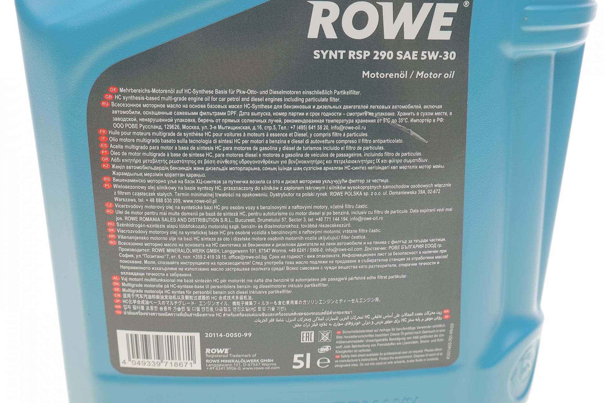 Олива моторна ROWE HIGHTEC SYNT RSP 290 5W-30 5л. 20114005099