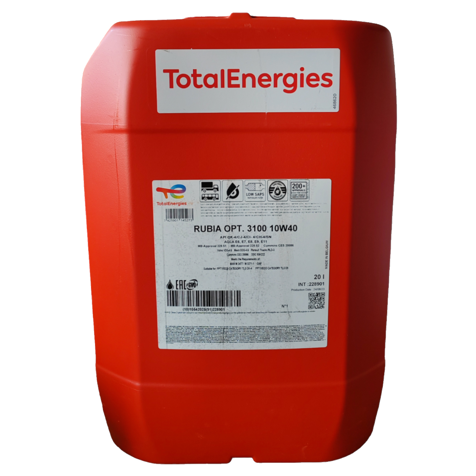 Моторна олива TOTAL RUBIA OPTIMA 3100 10w40 20л/18,8кг. TOTAL RUBIA OPTIMA 3100Синтетична олива TOTAL Rubia Optima 3100 з низьким вмістом SAPS і технологією Fuel Economy на основі останньої специфікації API CK 4 ідеально підходить для експлуатації важких дорожніх умов.Применение: Олива Rubia Optima 3100 призначена для використання в широкому спектрі двигунів, включаючи двигуни більшості виробників Euro VI і попередні моделі, такі як DAF (двигуни MX), які вимагають тривалих інтервалів заміни оливи. Воно також адаптовано до газових двигунів MAN, Mercedes-Benz, Scania, Renault Trucks і Volvo, а також деяких двигунів DAF.Особливості: Адаптовано до вимог більшості виробників Euro VI і попередніх моделей двигунів. Містить мийні, диспергуючі і протизносні присадки, що забезпечують чистоту двигуна і ефективне управління сажею, осадками і відкладеннями на поршнях. Має низький вміст SAPS і технологію Fuel Economy для підвищення економічності пального.Характеристики: Класифікація: SAE 10W-40, API CH-4/CI-4/CJ-4/CK-4/SN, ACEA E6/E7/E8/E9/E11. Кінематична вязкість при +40°C: 84,4 мм?/с. Температура застигання: -33°C. Температура самозаймання: +232°C. Індекс вязкості: 141.Специфікації та допуски: Одобрено: CUMMINS CES 20086, DTFR 15C110, DTFR 15C120, MACK EOS-4.5, MB-Approval 228.51, MB-Approval 228.52, Renault TRUCKS RLD-3, Volvo VDS-45.Олива TOTAL Rubia Optima 3100 10W-40 - надійне рішення для автомобілів та машинного обладнання, що експлуатуються важких умовах, забезпечуючи високий захист двигуна і ефективну роботу при тривалих інтервалах заміни оливи.