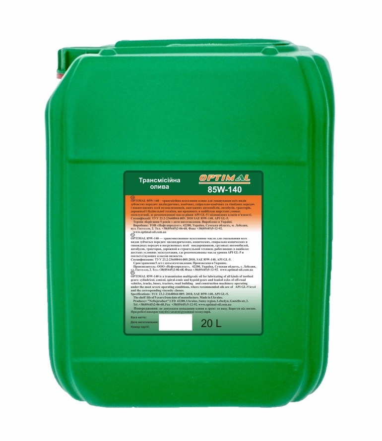 OPTIMAL 85W140 - трансмісійна всесезонна олива для змащування всіх видів зубчастих передач: циліндричних, конічних, спірально-конічних та гіпоїдних передач і навантажених осей позашляховиків, вантажних автомобілів, автобусів, тракторів, дорожньої і будівельної техніки, що працюють в найбільш жорстких умовах експлуатації, де рекомендовані масла рівня API GL-5 і відповідних класів в'язкості.