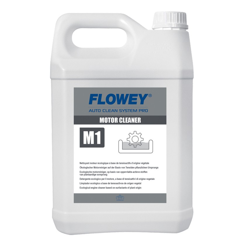 Очищувач двигуна FLOWEY MOTOR CLEANER М1 - 5 л. Екологічний очіщувач двигуна на основі поверхнево- активних речовин рослинного походження. Формула MOTOR CLEANER дотримується вимог відповідно до стандарту VDA та продукт не пошкоджує деталі двигуна, такі як алюміній, пластмаса, з'єднання.