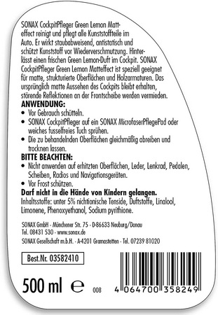 Очищувач-поліроль пластика SONAX Cockpit Pfleger Lemon Fresh 0.500л (358241)