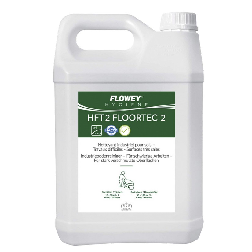 Низькопінний лужний миючий засіб FLOWEY FLOORTEC2 FT2 - 1 л. FT2 FLOORTEC 2. Низькопінний лужний миючий засіб. Розроблений для регулярного очищення керамічних, бетонних, гумових поверхонь, плитки, мармуру, лінолеуму, поверхів. ОБЛАСТІ ЗАСТОСУВАННЯ: Офіси, приймальні, готелі, ресторани, спортивні центри, аеропорти, залізничні станції, школи тощо. ЗАСТОСУВАННЯ: Підлогомийна машина: Підмітіть підлогу перед миттям. Розчиніть від 0.5 до 3% залежно від ступеня забруднення. Для ручного прибирання: 1-2 кришечки на відро води. Використовуйте швабру для прибирання. Для кращого ефекту, промийте чистою водою.