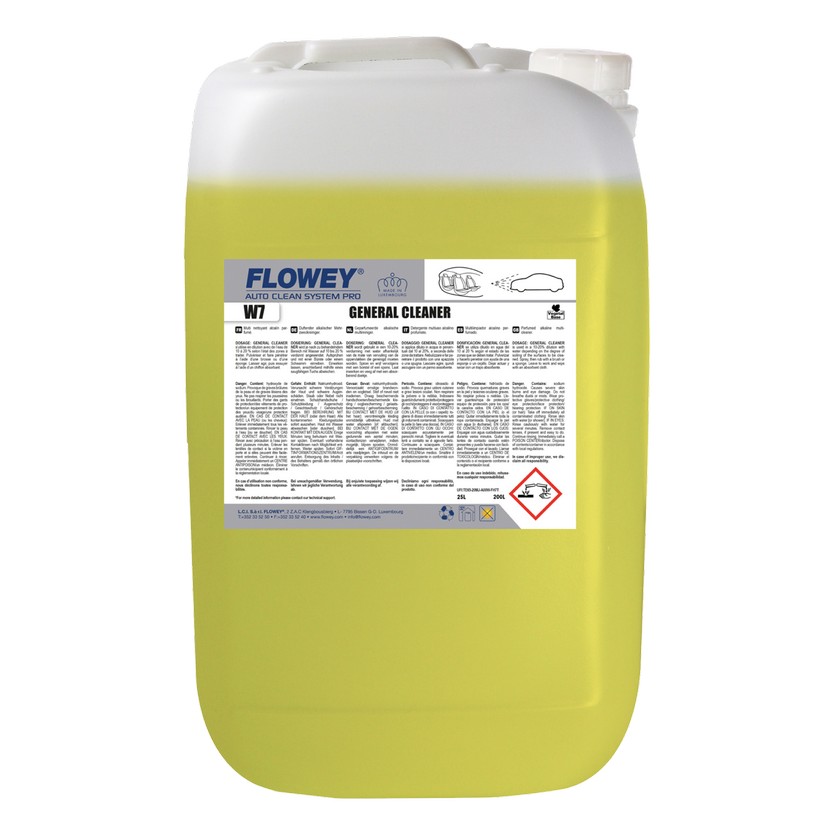 Універсальний очищувач FLOWEY GENERAL CLEANER W7 - 25 л. Легко видаляє забруднення, характерні як для салону автомобіля, так і для кузова. Застосовується для очищення пластику, текстилю, шкіри.
