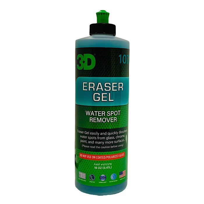 Eraser Water Spot Remover Очищувач для видалення водного каменю - гель. 3D Eraser Gel Water Spot Remover дозволяє легко видалити непривабливі плями від води та мінеральні відкладення. Крім того, ця потужна, але безпечна формула густого гелю на кислотній основі ефективна на відміну від більшості рідких засобів для виведення плям, представлених на ринку.