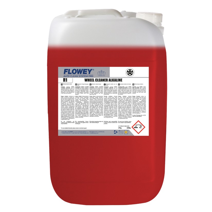 Лужний очищувач дисків FLOWEY WHEEL CLEANER ALKALINE R1 - 25 л. Дуже легко очищає лаковані алюмінієві колісні диски, сталеві колісні диски та ковпаки. Видаляє поклади та пил від гальм та відновлює первісний зовнішній вигляд коліс.