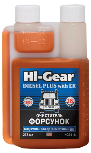 Очиститель форсунок для дизеля (содержит "Победитель трения") Hi-Gear DIESEL PLUS with ER. Поставляется в упаковке с дозатором (в унциях). Содержит кондиционер металла ER. Рекомендуется использовать через каждую 1000 км пробега либо чаще – при использовании топлива невысокого качества.