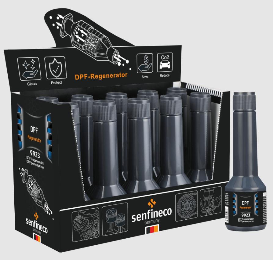 DPF Regenerator – професійний продукт призначений для швидкого та ефективного очищення засмічених сажових фільтрів (DPF) і зменшення рівня викидів сажі. Використання цієї присадки дозволяє повністю спалювати низькоякісне дизельне паливо з високим вмістом сірки при більш низькій температурі згоряння. Частинки сажі та сірчана кислота будуть видалені до того, як вони утворюються. Таким чином, не тільки протисажевий фільтр (DPF) буде захищений, але і моторне масло буде підтримуватися чистим, захищеним від старіння та окислення.