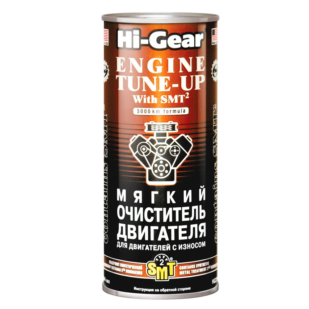 Мягкий очиститель двигателя со средним и сильным износом, с SMT2 Hi-Gear ENGINE TUNE UP with SMT2 Содержит синтетический кондиционер металла второго поколения SMT2, который обеспечивает оптимальные условия эффективной очистки, создает на трущихся поверхностях защитный микрослой, препятствующий образованию лаковых пленок, углеродистых отложений и нагара.