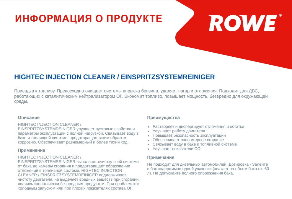 Присадка в паливо (бензин) HIGHTEC INJECTION CLEANER ROWE (22002000299)