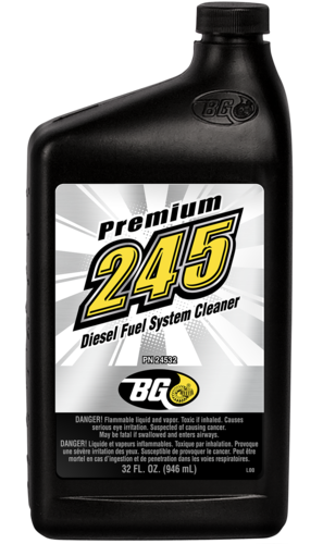 Очисник паливної системи преміум-класу BG 245® розчиняє та видаляє відкладення з усієї системи впорскування дизельного двигуна, включаючи паливні форсунки та камери згоряння. Він змащує паливні насоси та форсунки і містить цетановий покращувач. Він особливо ефективний для видалення важких відкладень всередині форсунок високотемпературних двигунів з системою впорскування Common Rail (HPCR) високого тиску та високої температури.