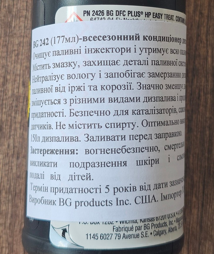 Кондиціонер-антигель паливної дизельних авто BG DFC+ (в бак) 177 мл. Всесезонний дизельний паливний кондиціонер з антигелем та зі змазкою. Залити в бак перед заправкою на 50-150 л. диз.палива. Використовувати до зниження температури (-3;-5 С°).