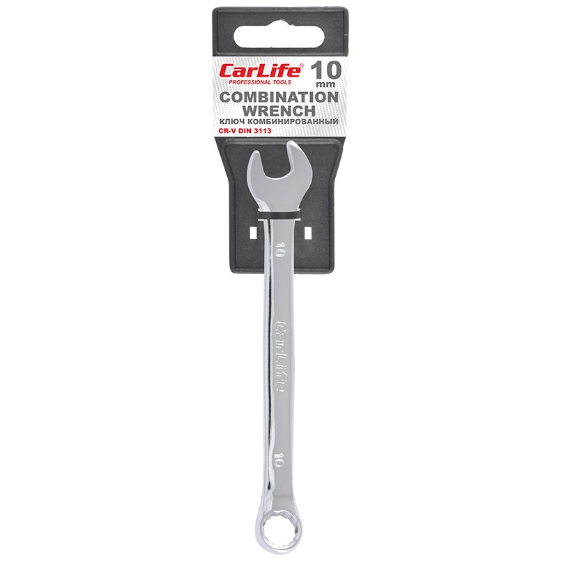 Ключ комбінований CARLIFE CR-V,10 мм, хромово-ванадієва сталь, нікель-хромоване покриття, кільце під кутом 15° DIN 3113, з тримачем