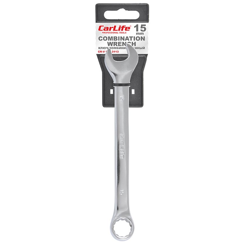 Ключ комбінований CARLIFE CR-V,15 мм, хромово-ванадієва сталь, нікель-хромоване покриття, кільце під кутом 15° DIN 3113, з тримачем
