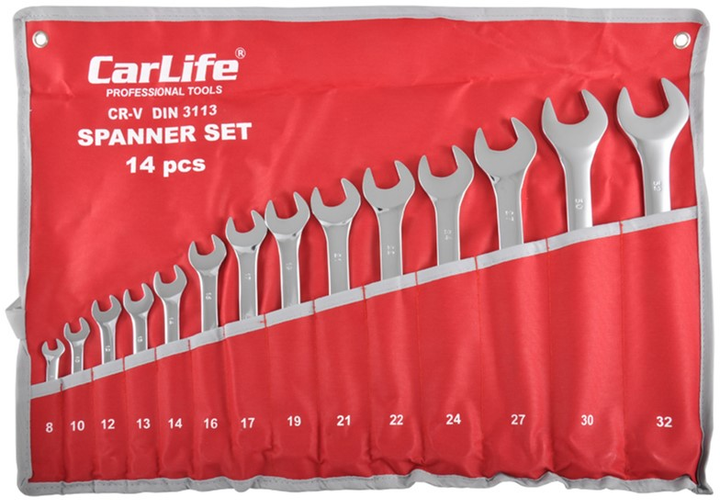 Набір ключів комбінованих CARLIFE CR-V, 14шт., 8-32 мм, 8-10-12-13-14-16-17-19-21-22-24-27-30-32, хромово-ванадієва сталь, нікель-хромоване покриття, кільце під кутом 15°, DIN 3113, уп. чохол