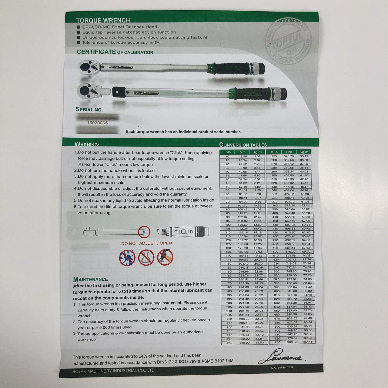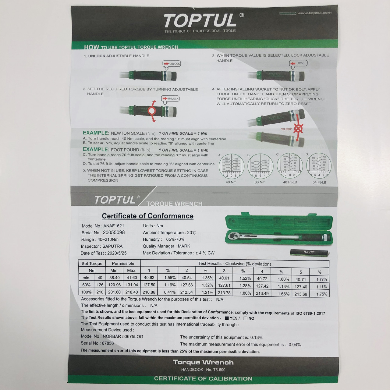 Динамометричний ключ 1/2" TOPTUL 535mm 40-210Nm ANAF1621. Динамометричний ключ — професійний гайковий ключ має в своєму корпусі динамометрическое пристрій, для суперточного визначення зусилля затягування кріплення. Використання такого інструменту різноманітно - від високоточної збірки вузлів і деталей двигуна авто до обслуговування спец. частин і елементів енергетичних та інших навантажувальних установок авіа і ж/д транспорту. Виділяють кілька типів ключів: шкальні, стрілочні і граничні. Прежде чем купить динамометрический ключ, необходимо своё особое внимание сфокусировать на некоторые характеристики инструмента: подбор ключа должен происходить таким образом, чтобы необходимый вам момент затяжки любого доступного резьбового соединения находился примерно в середине возможного диапазона работы данного ключа. Также динамометрический ключ имеет различный размер квадрата и поэтому нужно заранее определить точный тип крепежа с которым вы планируете вести работы, так как разным размерам головок соответствуют различные квадраты для состыковки с «динамиком». | Динамометричний ключ, наприклад, граничного типу, або як його ще називають «щелчкового типу», вважається найбільш універсальним. Його призначення - затягування з'єднання за годинниковою стрілкою з встановленими заздалегідь зусиллям. Зовнішній вигляд ключа схожий на звичайну тріскачку з шкалою у рукоятці. | Ми пропонуємо оригінальний динамометричний ключ (серії ANAF), виготовлений з особливо високоякісної, високоміцної і дуже надійною сталі, вироблений тайванським заводом Toptul .