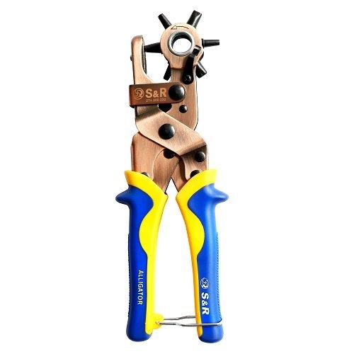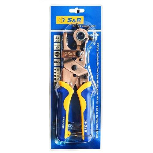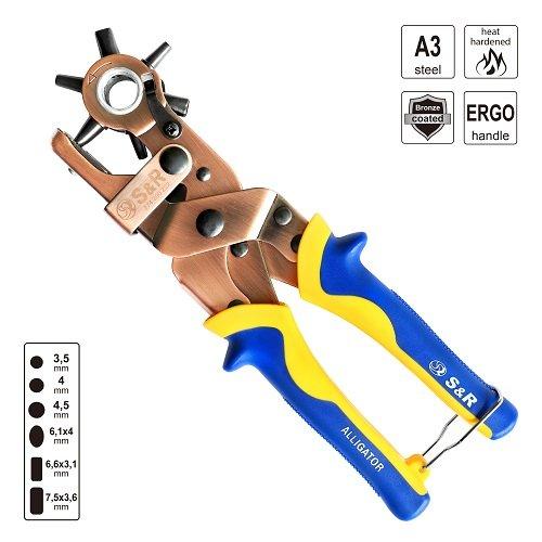 Дироколи S&R Алігатор призначений для пробивання круглих, овальних, прямокутних, отворів у шкірі, картоні, товстій тканині, гумі, пластиці та ін. Дуже зручний інструмент як для домашнього користування, наприклад зробити додатковий отвір у ремені, для хобі, а також для професійного використання у майстернях, для ремонту взуття та різних виробів. Щоб проробити отвір потрібно виставити штир потрібного діаметру і натиснути з зусиллям на рукоятки. різного діаметру та форми: