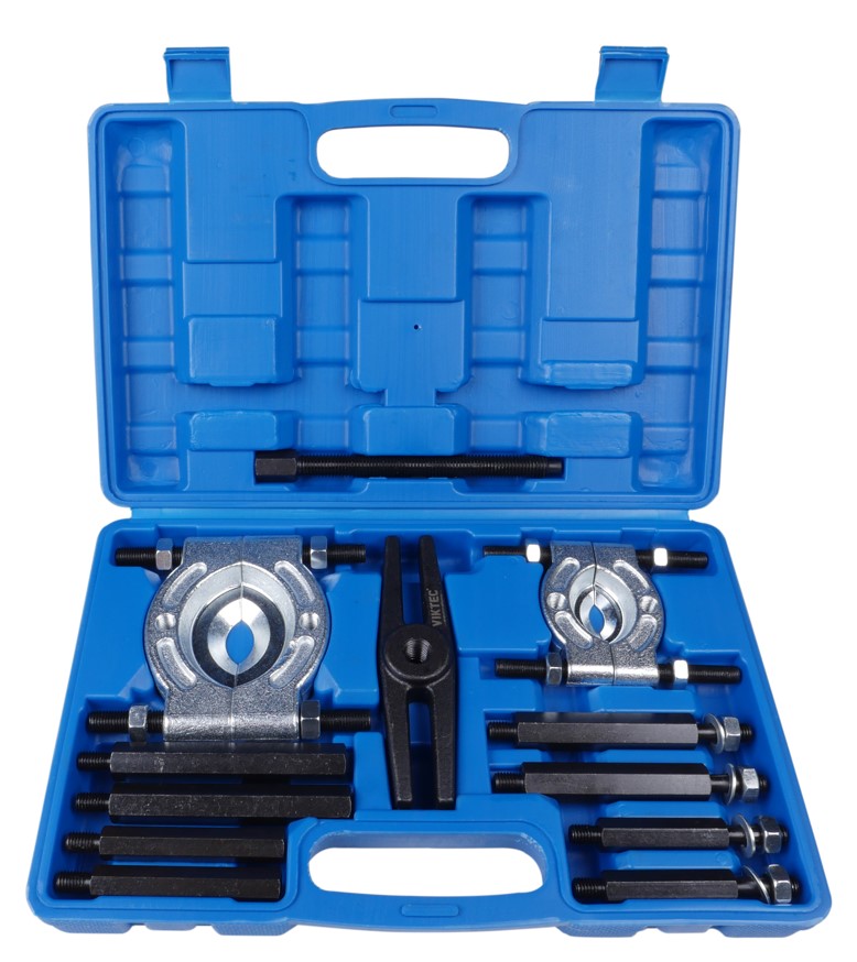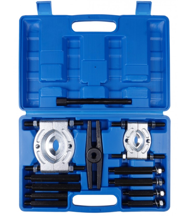 У комплект входять два знімники підшипників 30-50мм та 50-75мм. Демонтує підшипник за допомогою Н-подібної балки та болтів. Призначений для роботи із підшипниками. Болт завзятий 180мм. Подовжувачі: 4*130, 4*105мм. Н-подібна балка 160мм. Упаковка: міцний переносний кейс.